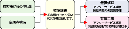 定期サービス点検他、お客様からの申し出(不具合・気になる箇所)があった場合、アフターサービス担当者がその状態を確認に伺い、その後所定の方法により補修・施工を行います。無償または有償となります。