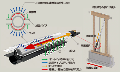③この時、ロッドと加圧パイプの間に摩擦抵抗が生じるため、建物の揺れが小さく抑えられます。